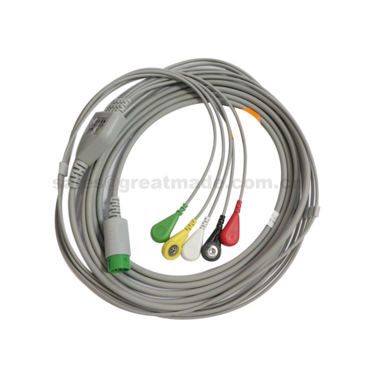Mindray Beneview T5と互換性のある一体型5リードシールドECGケーブル。 T6。 T8、PM5000、PM 6000、スナップ、IEC、12フィート、ラウンド12ピン