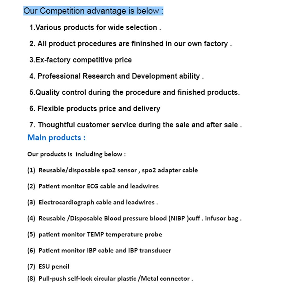 深センGreatmade Tech LTDは、マルチパラメータ患者モニター、パルスオキシメーター、EKGデバイス、血圧モニター、電気外科ユニットで広く使用されている医療ケーブルの専門メーカーです。 この分野で10年の経験があります。 私達にシンセン中国の本土に私達の自身の工場があり、完全な製造装置およびテストdevice.Weはまたさまざまな市場の必要性を満たすために専門の研究開発のチームを造ります。 当社の優れた品質、お得な価格、思いやりのあるサービスは、国内および国際的な顧客の永続的なサポートを獲得しています。